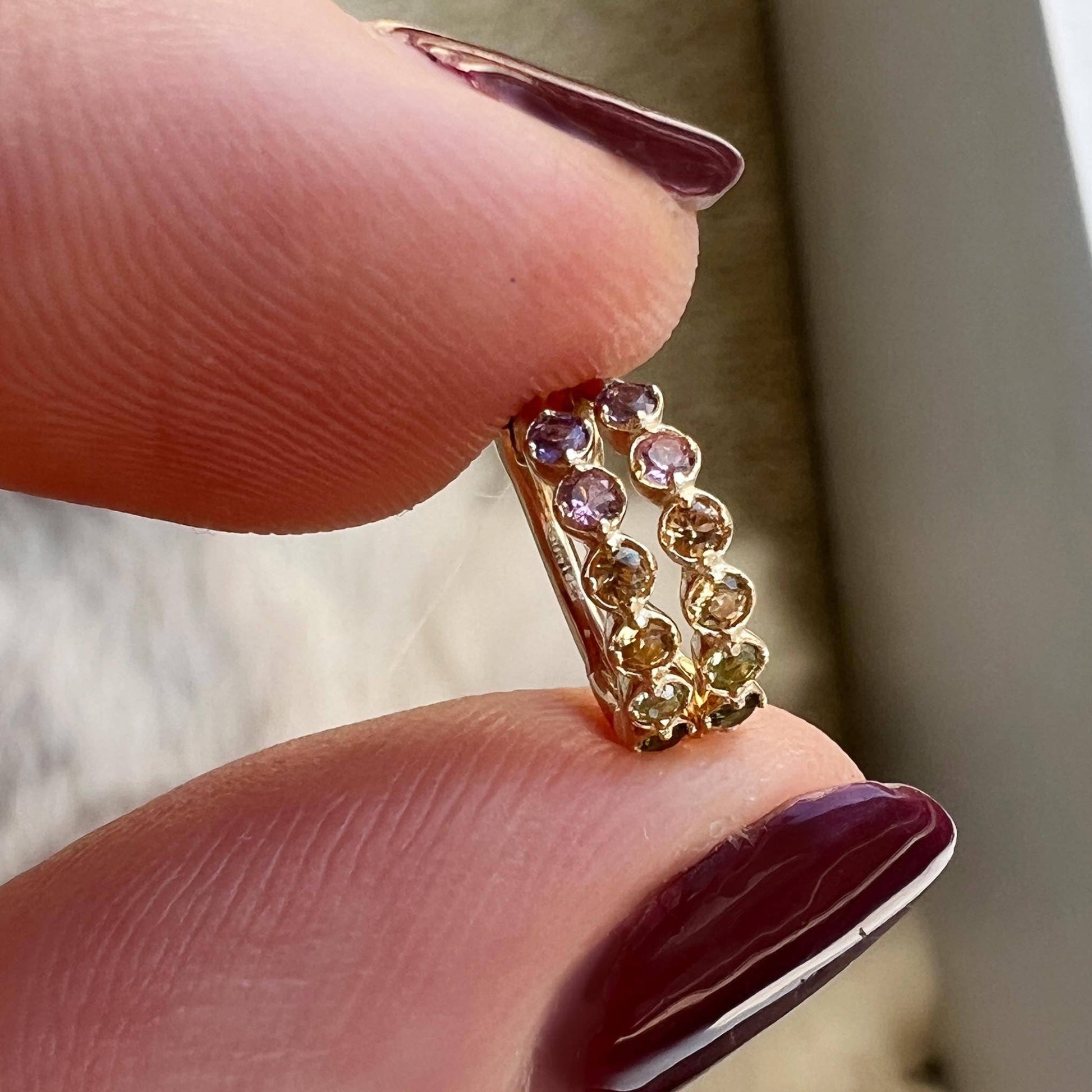 Slip on a splash of color with these delightful 14kt gold rainbow mini hoops! Each pair features a stunning lineup of natural gemstones—amethyst, pink tourmaline, orange sapphire, peridot, citrine, green tourmaline, and blue topaz—all set at a dainty 1.4mm. Perfect for layering or wearing solo, these lightweight beauties bring everyday sparkle without the fuss. Mix, match, and rotate through the rainbow to match your mood!