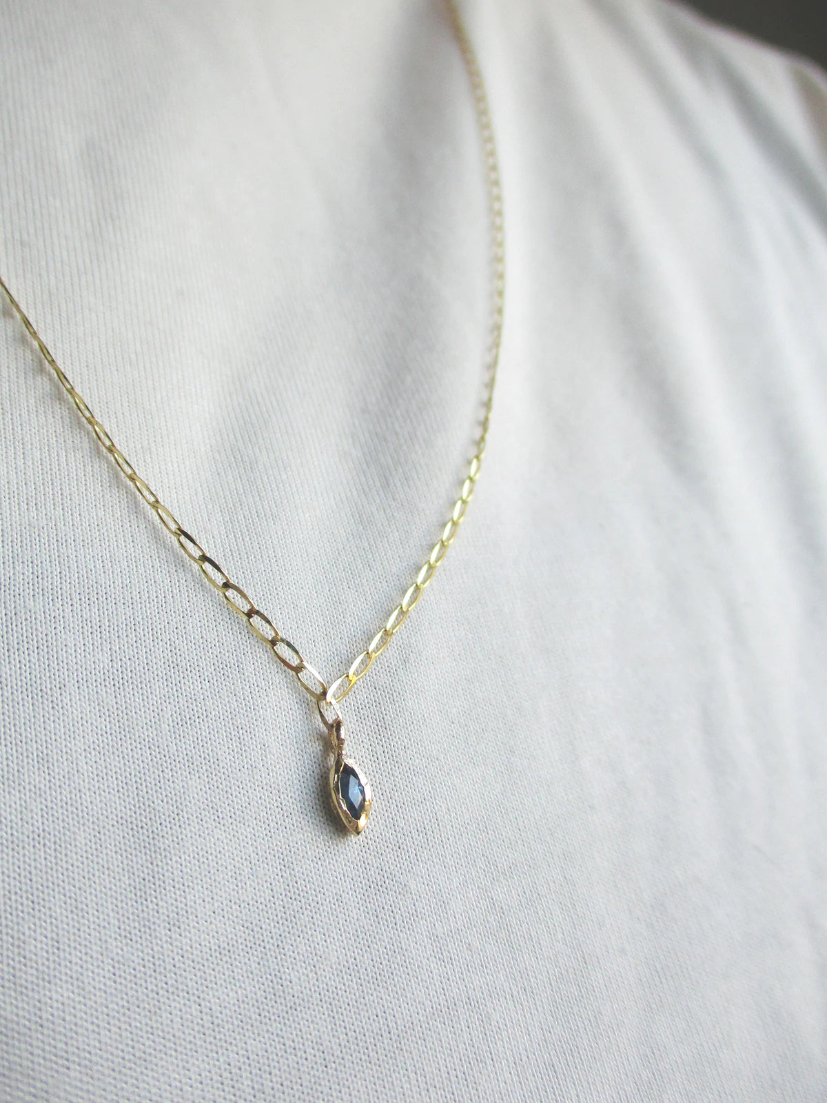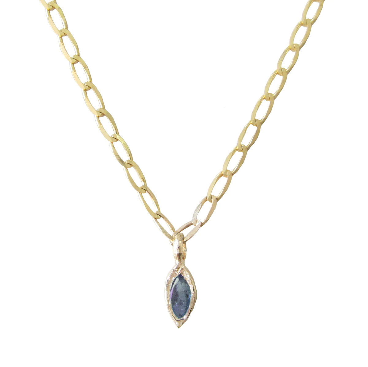 Marquis blue sapphire measures approximately 4x2mm. Necklace measures approximately 24" in length.