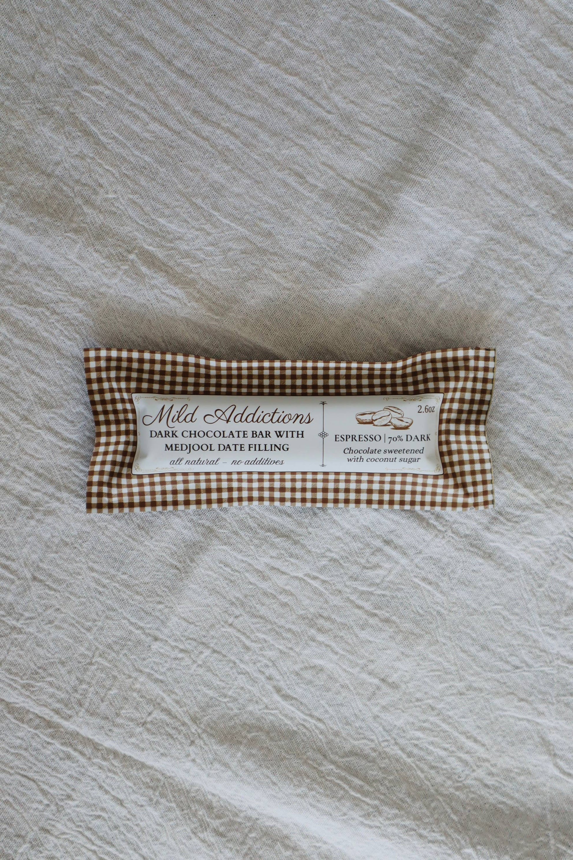 Indulgences, without the additives. Our new smaller 2.6 oz natural dark chocolate bar with a sweet organic Medjool date + espresso center. Our boldest bar yet!