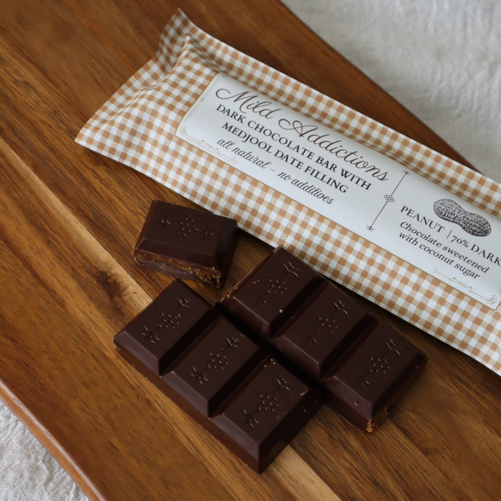 Indulgences, without the additives. Large 4.5 oz natural dark chocolate bar with a sweet organic Medjool date + peanut butter center.