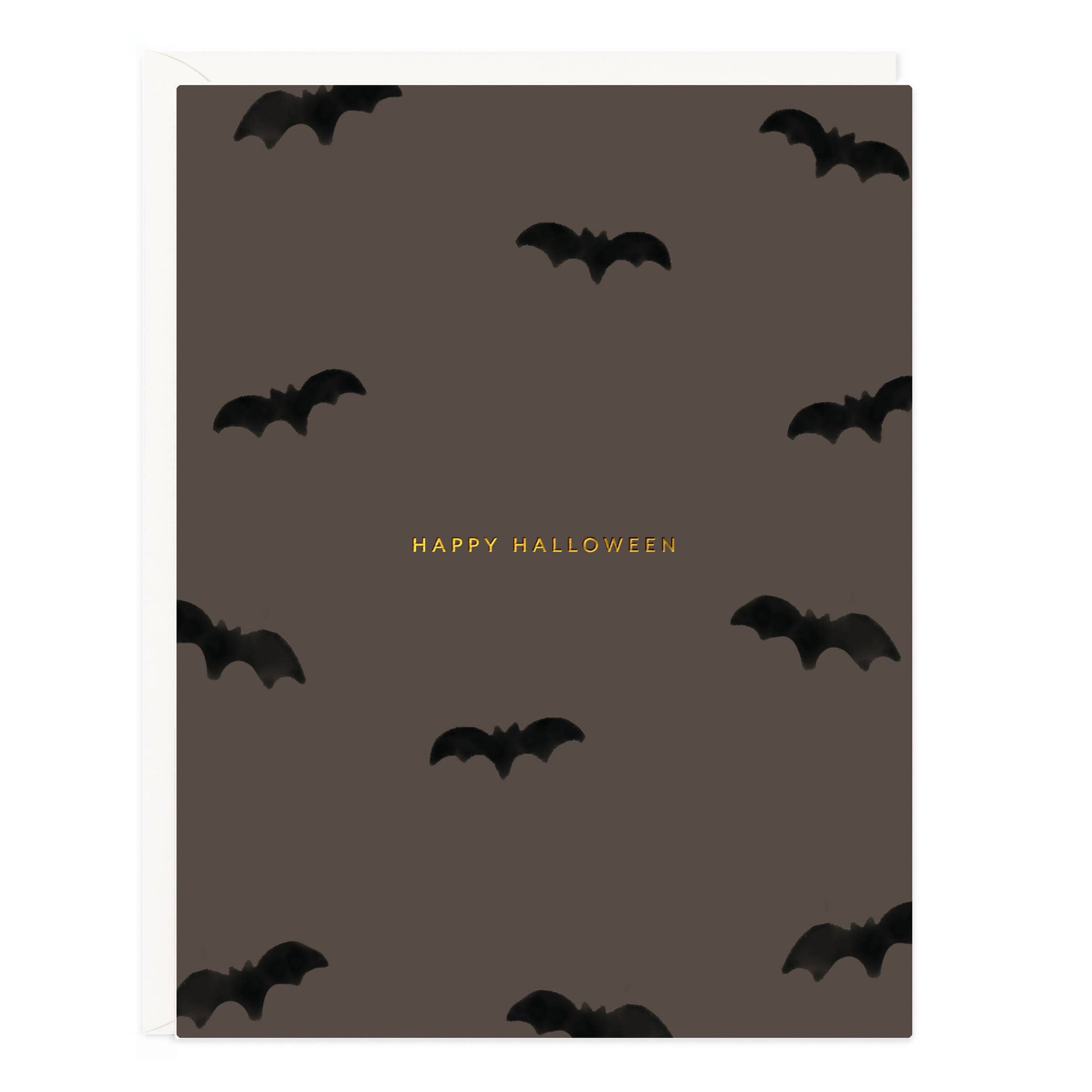 A moody palette of painterly bats pair with gold foil to wish a Happy Halloween. Paper: Crisp white heavyweight paper