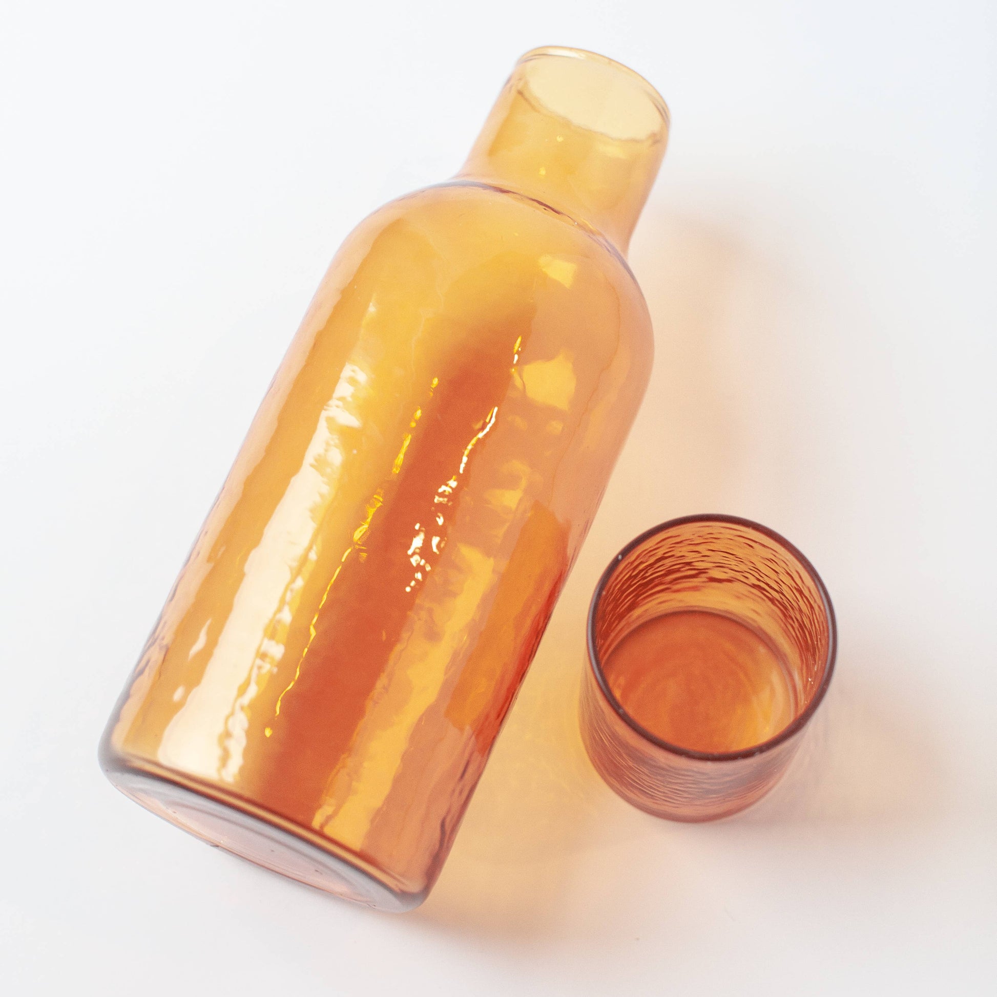 Form meets function in these stunning glass carafes. Each is handblown from recycled glass then meticulously hammered by hand for a truly unique finish. The set includes a carafe and lid that doubles as a small drinking glass.