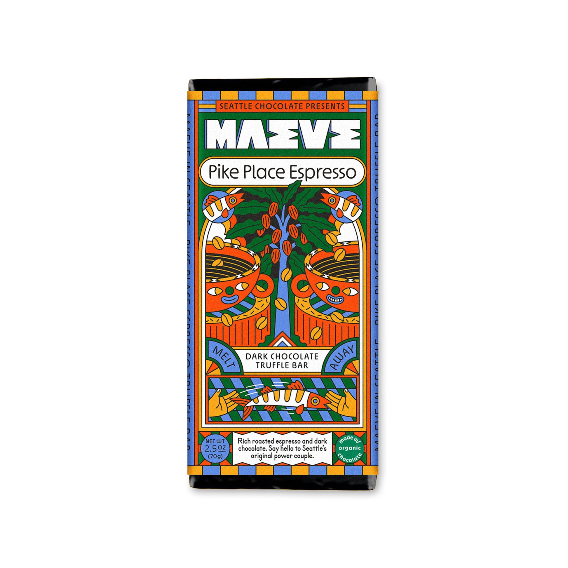 Pike Place Espresso is a Maeve classic - a deliciously deep dark chocolate truffle bar infused with bold decaffeinated espresso, roasted less than 2 miles from our factory. Wow, it was meant to be.