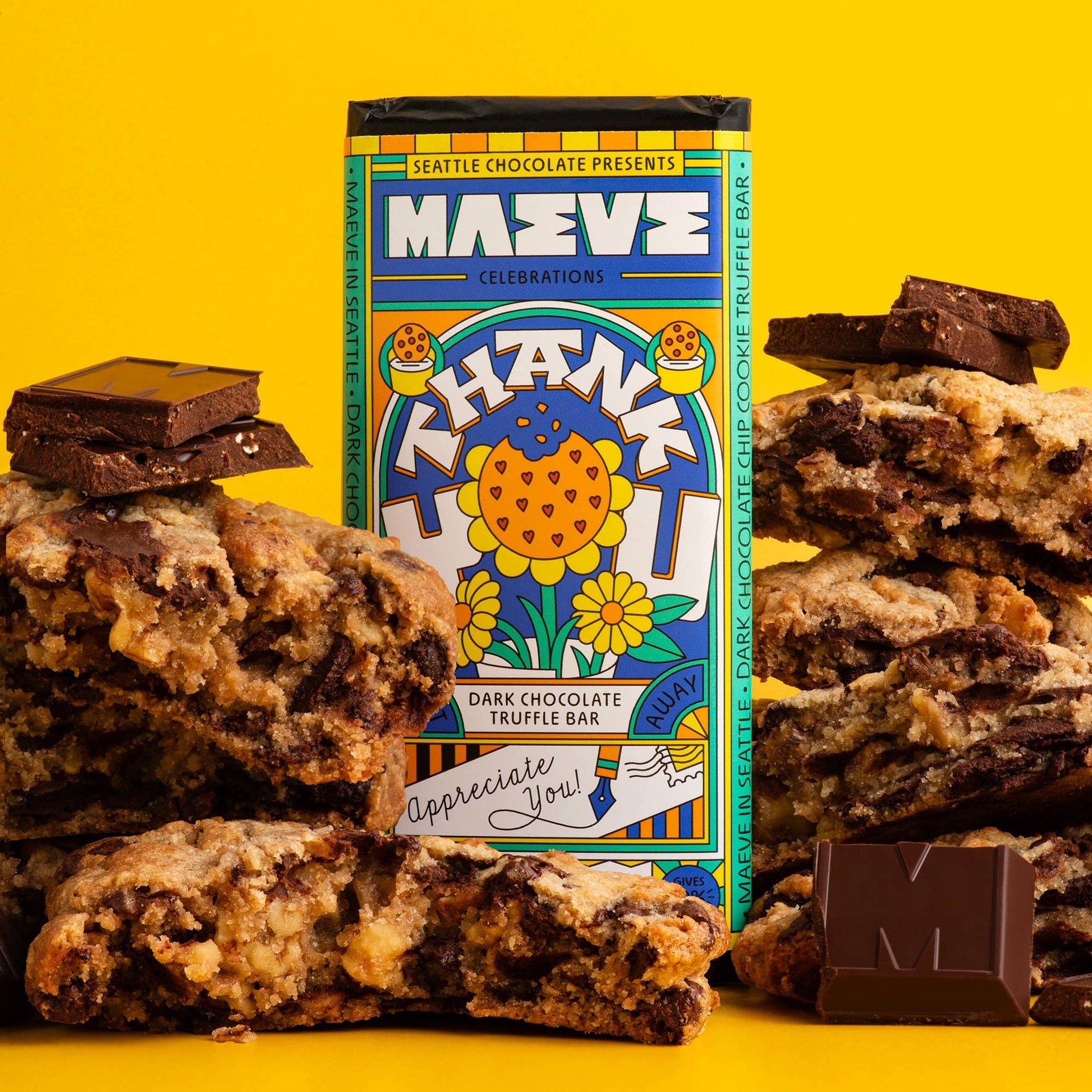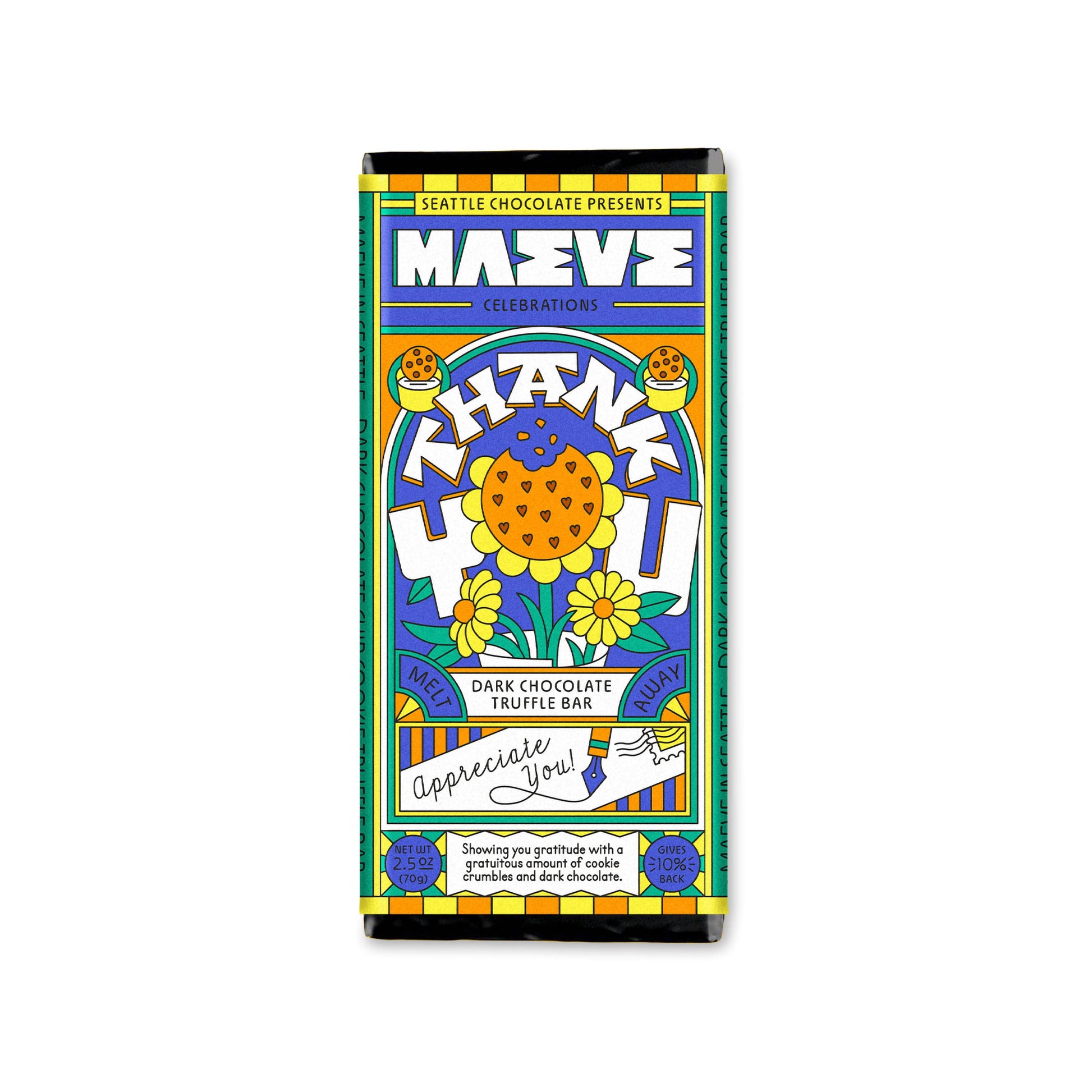 Maeve’s Thank You truffle bar is decadent dark meltaway chocolate brimming with gratitude AND packed with mini, crunchy chocolate chip cookie pieces. Made with organic chocolate. (2.5oz)